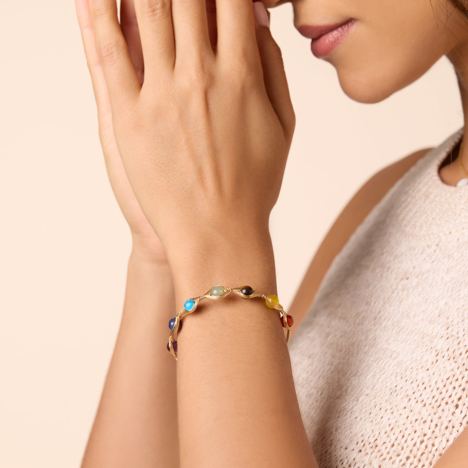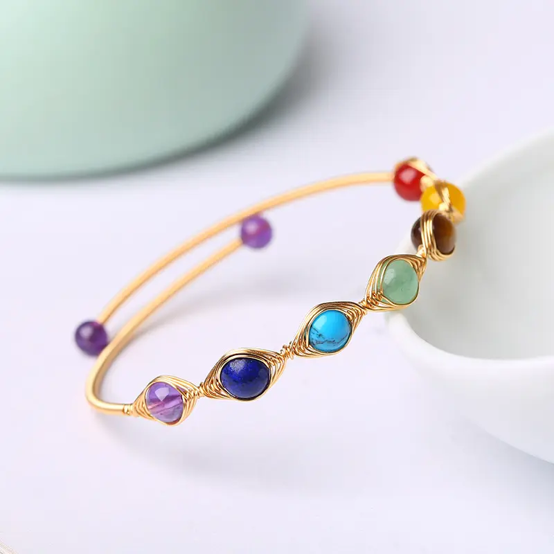 This 7 Chakra bangle helps balance and align the body's energy centers, known as the chakras, for improved physical, emotional, and spiritual well-being. It is believed that wearing this bracelet can promote bodily healing, emotional balance, and emotional wellness.