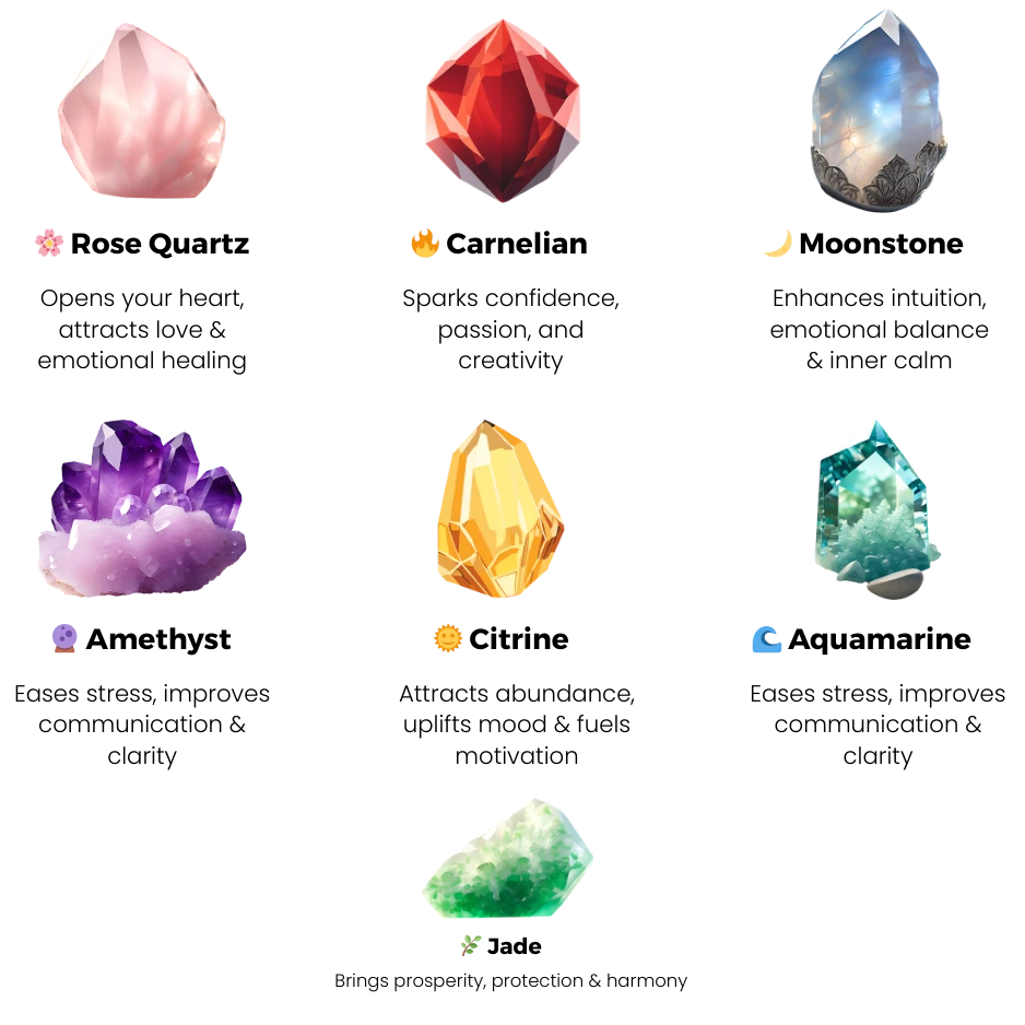 Stones: Rose quartz, Carnelian, Moonstone, Amethyst, Citrine, Aquamarine, Jade.