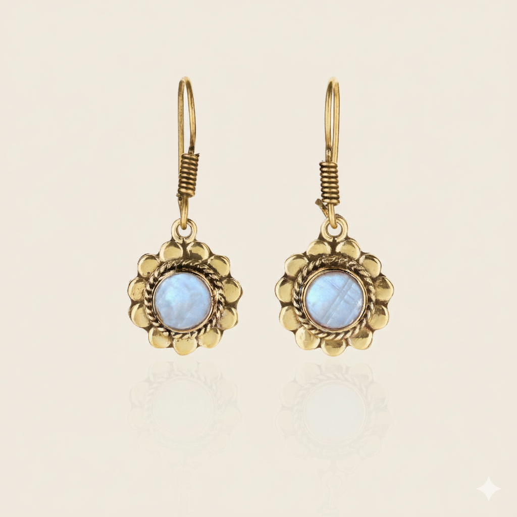 Add a touch of elegance and joy to your everyday look with the Blush earrings. Forged in brass and embedded with beautiful rainbow moonstone, these earrings are sure to turn heads. The rainbow moonstone brings a touch of magic to the earrings and will add some positivity and balance to your life.These earrings are light and comfortable to wear, making them perfect for long-term wear. They are made with pure brass and are 100% nickel-free, making them safe for those with sensitive skin.