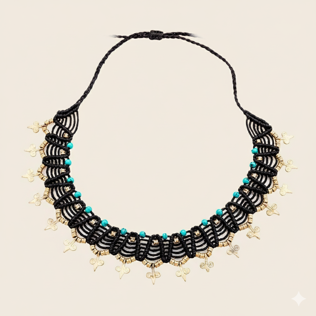 Introducing the Holi Choker: a handcrafted celebration of love and color inspired by the sacred Hindu festival. Skillfully designed using macramé techniques, the choker combines calming turquoise beads and vintage-style brass elements. It's not just an accessory; it's wearable art that will turn heads wherever you go.